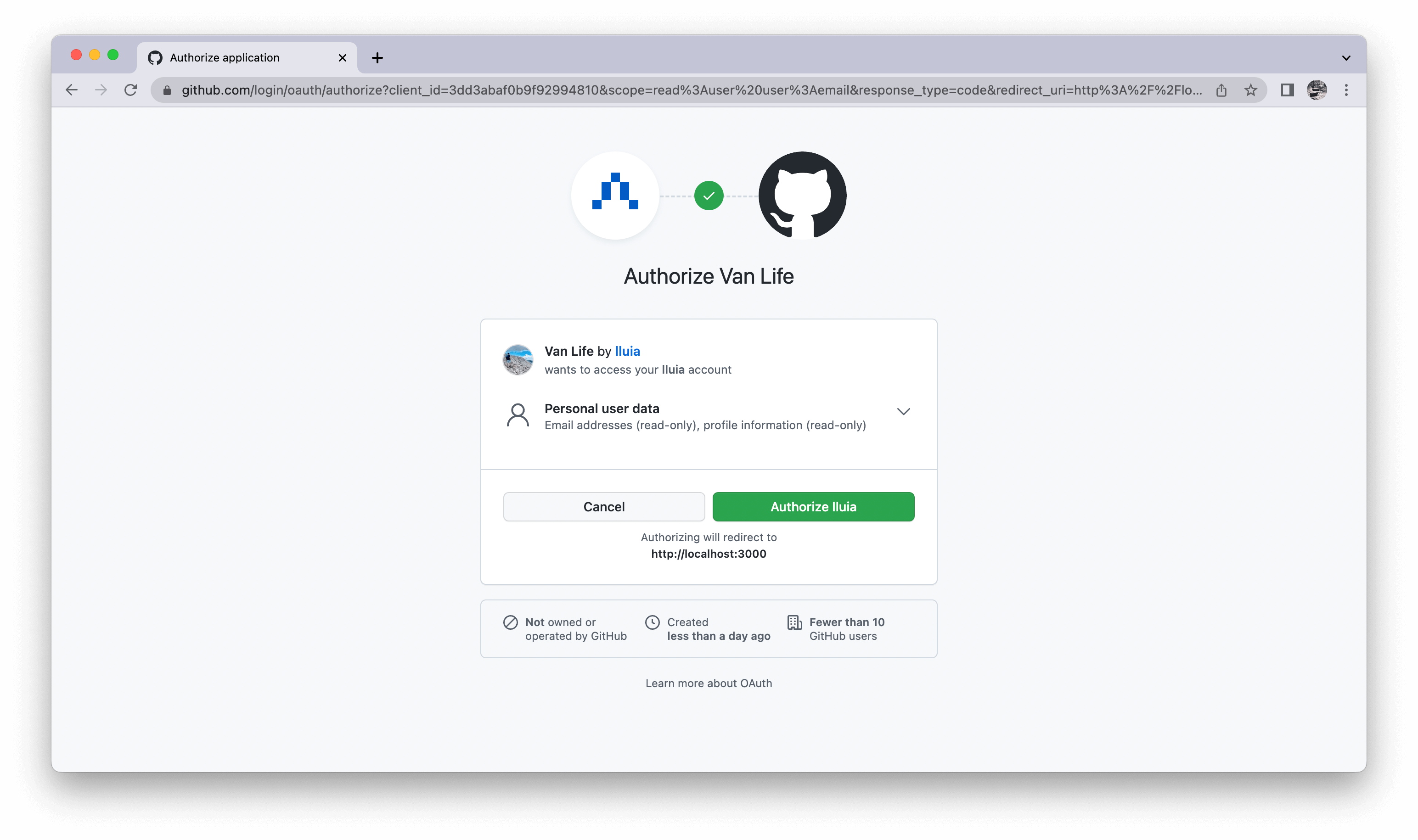 If we were to deploy our app to production, we would need to create a new OAuth App in GitHub (calling it something like "Van life β prod") and point the callback URL to our production domain: https://example.com/api/auth/callback/github