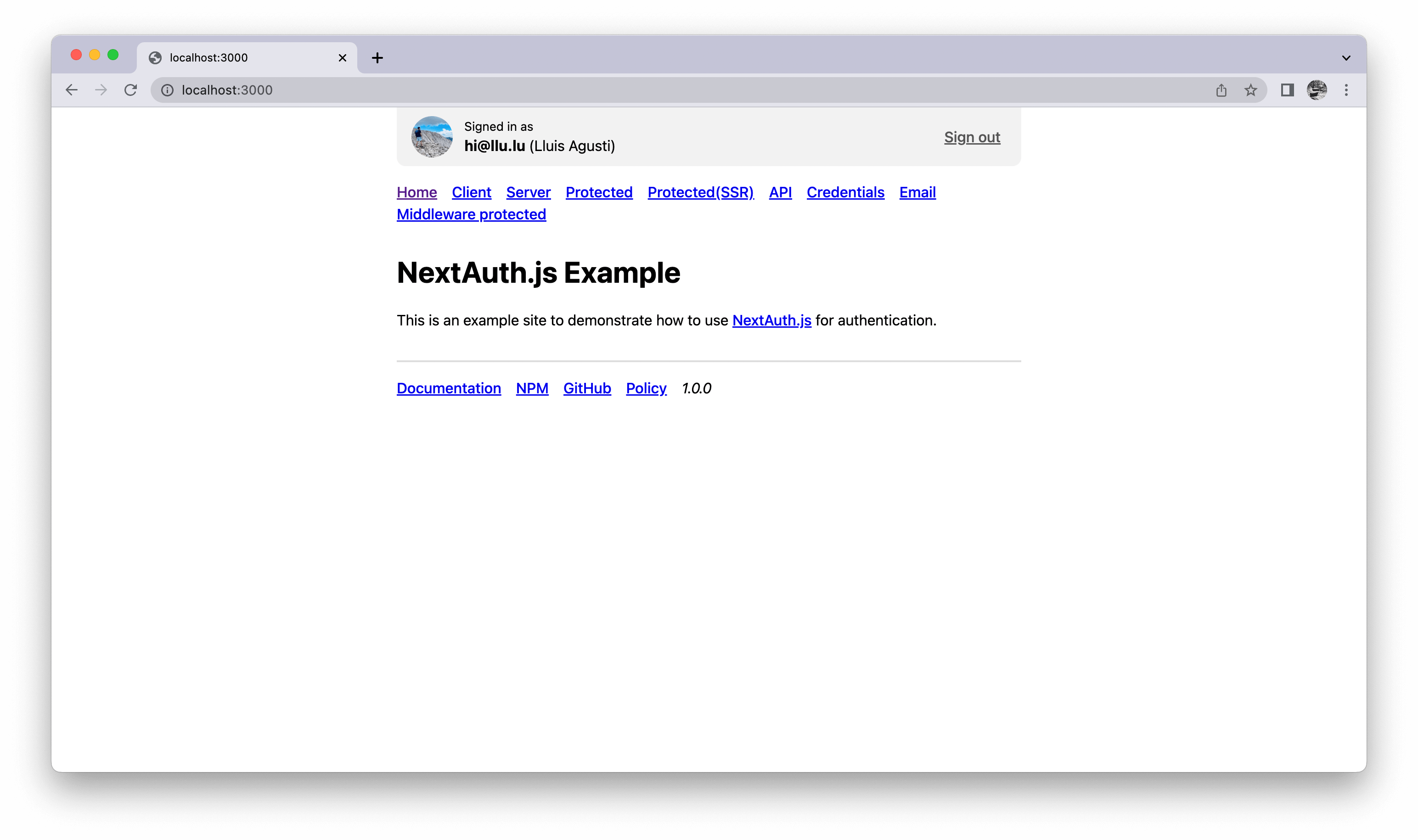 Once inserted and correct, GitHub will redirect the user to our app and NextAuth.js will take care of any further calls with GitHub to get access to the user profile and start a user session safely in the background: