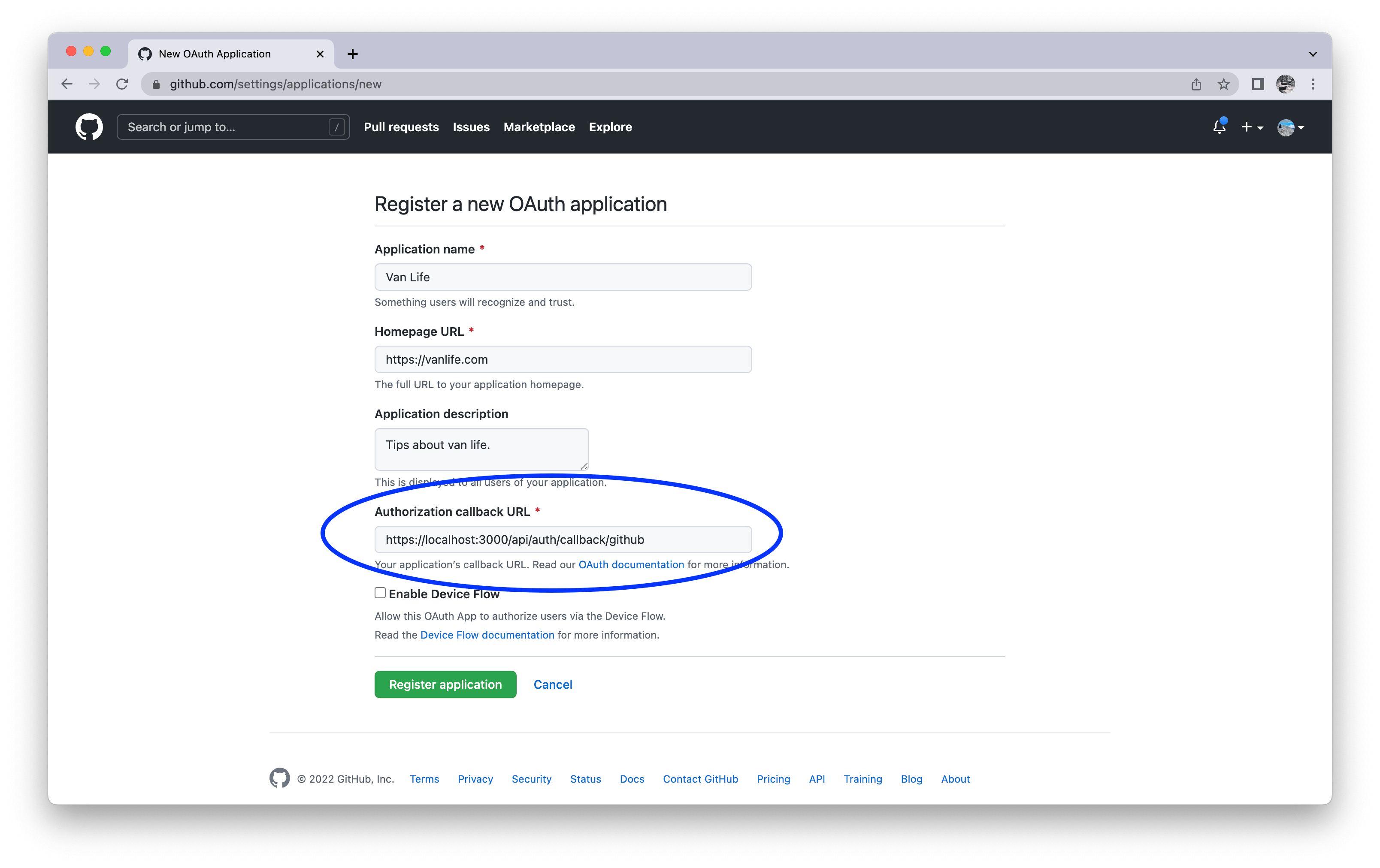 Next, you'll be presented with a screen to add details about your new application. Fill in the required fields, but pay extra attention to the Authorization Callback URL one: