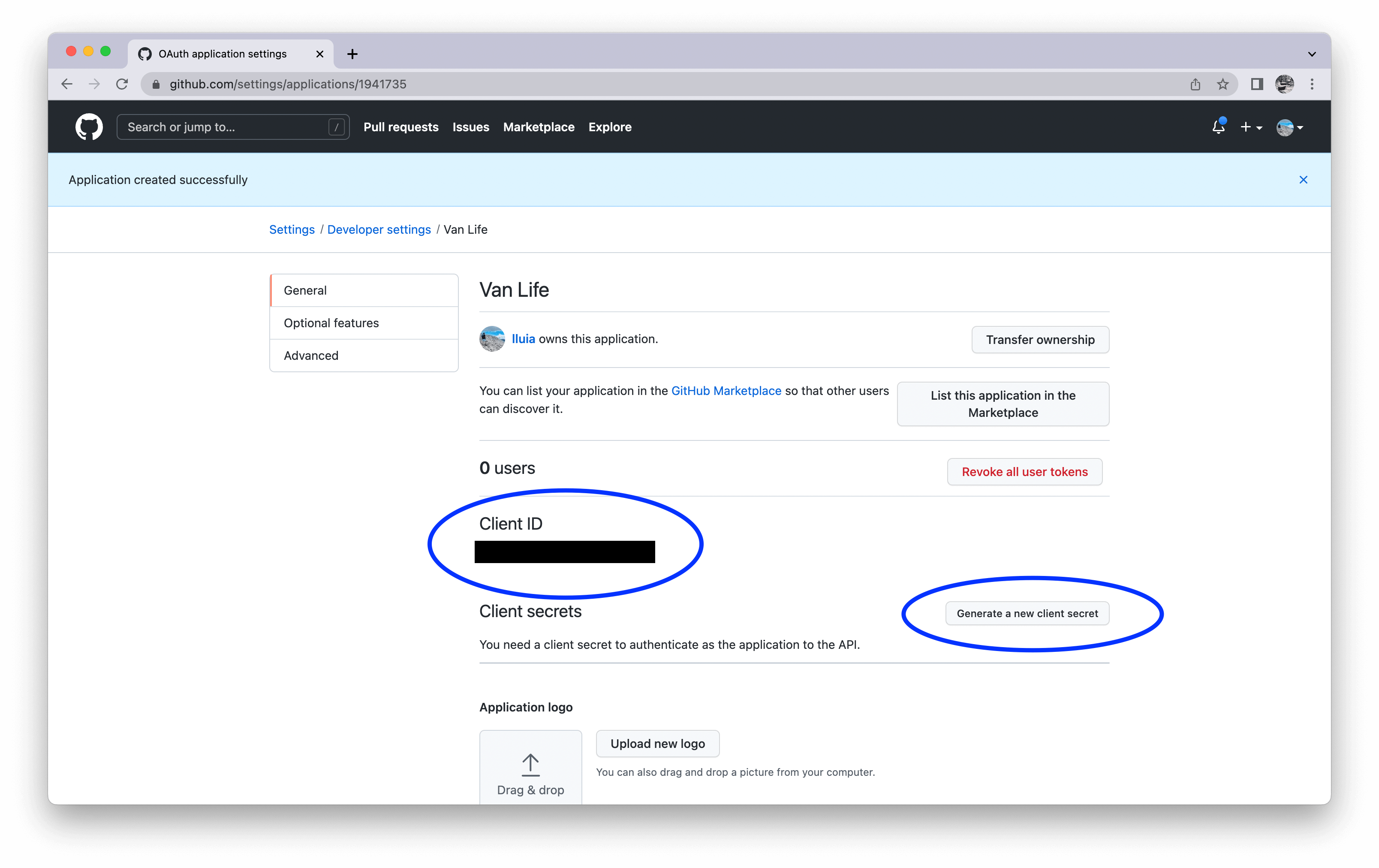 The Client ID is always there, a public identifier of your OAuth application within GitHub. Click on the Generate a new client Secret button and should be presented with a new string (which is just a randomized string).